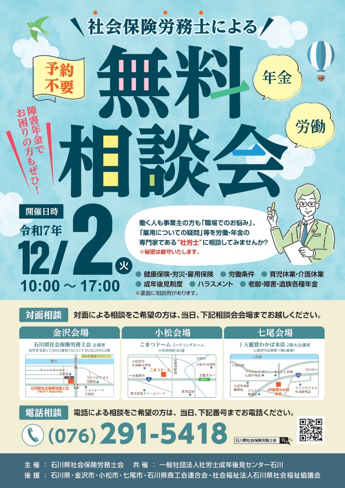 石川県社会保険労務士会では、12月2日を社会保険労務士の日(社会保険労務士法制定日)とし、無料相談会を開催します。